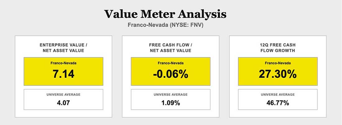 Franco-Nevada’s free cash flow-to-net asset value (FCF/NAV) stands at about -0.1% against a market average of 1.1%. Investors are paying a large asset premium while receiving a negative – albeit only slightly – cash yield per dollar of NAV.