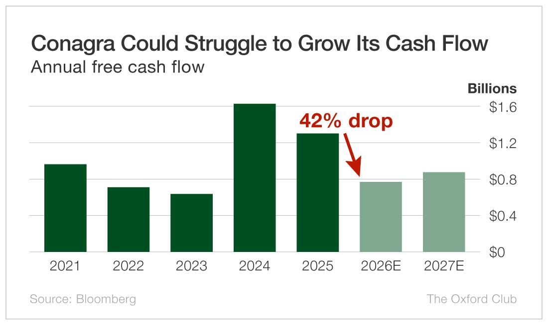 Finally, Conagra has announced no plans to cut its dividend, which is going to throw its dividend payout ratio out of whack. Its payout ratio for 2025 sat at 51.4%, but due to the massive estimated decrease in free cash flow for 2026, that ratio is estimated to jump to 88.0% – above our threshold of 75%.